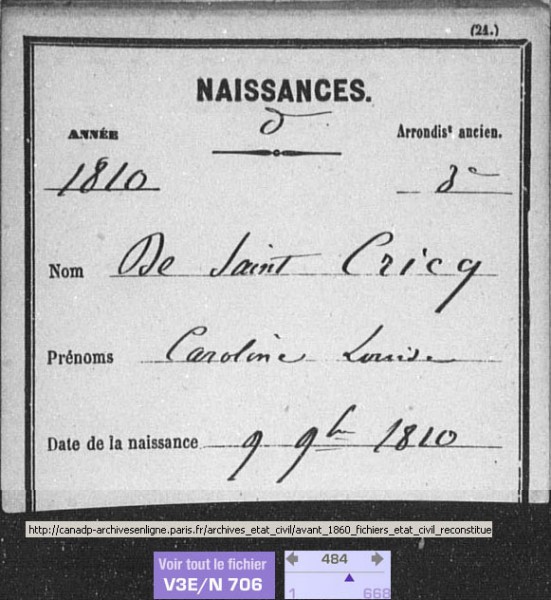 This (hard to find) document states that the Count and Countess had five children, two of which died at early age. Given the fact that the article incorrectly states the decease date of Caroline’s mother this leaves doubt on its accuracy. Additional research at Paris Archives is needed to confirm the birth of Alphonse and perhaps one more child (not found under Cric, Cricq, Criq, Saint Cricq, or De Saint Cricq). - Lycée Napoléon, Distribution des prix faite aux élèves, le dix-sept août 1809, Paris, p 13, 16, 18, 19.